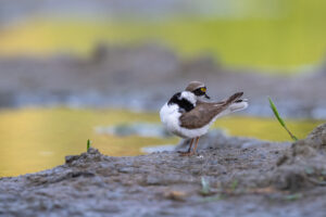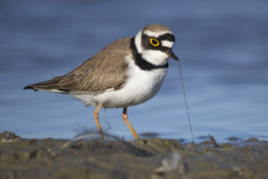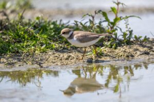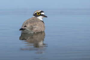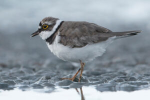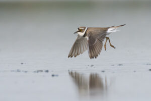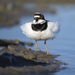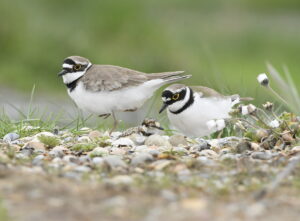 De kleine plevier is naaste familie van de bontbekplevier en de strandplevier. Qua uiterlijk lijken ze dan ook erg op elkaar. Welke de mooiste is, is een kwestie van smaak. De kleine plevier heeft meer vleeskleurige poten, terwijl die van de bontbekplevier oranje zijn. Maar het duidelijkste kenmerk is het fel gele oogringetje bij de kleine. Een miniem detail, waarvoor je de vogel wel van nabij moet kunnen bekijken. En dat kan dus in Gruttoland. In het voorjaar foerageren en baltsen de vogeltjes tot vlak voor de hutten. Tijdens de balts zet het mannetje een hoge borst op om het vrouwtje imponeren.