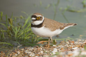 Een altijd graag geziene gast in Gruttoland is de kleine plevier. Een klein druk steltlopertje dat altijd bedrijvig in de weer is. Met de nieuwe dobbe enkele jaren geleden kreeg ook de kleine plevier vaste grond onder de voeten. Vrijwilligers en fotografen konden hun geluk niet op toen de vogels gingen broeden en nu jaarlijkse gasten zijn. Niet zomaar langs de rand van de plas, maar op het dak van een van de vogelhutten. Precies zoals boer Murk het bedacht had. Een laag schelpjes op het dak van de hut en de vogels doen alsof ze op een schelpenstrand zitten.