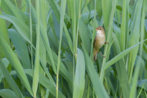 Een brede rietkraag heeft de kleine karekiet niet nodig om in te nestelen. Dat nest is ook wel heel speciaal. Hij vlecht een degelijke nestkom tussen drie rietstengels en het geheel deint heerlijk mee op en neer in de wind. Kleine karekieten overwinteren in tropisch Afrika en komen eind april naar Europa om te broeden. Zoals gezegd is het een onopvallend bruin zomervogeltje, maar zijn zang maakt het gehele voorjaar en zomer goed.