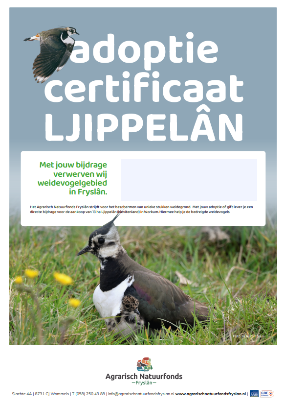 Doe dan een gift of adopteer vierkante meters Ljippelân. Adoptie is mogelijk vanaf € 7,50 per m2. Als bewijs ontvang je per mail een mooi certificaat met daarop jouw naam, het gedoneerde bedrag en aantal geadopteerde vierkante meters. Ook leuk om cadeau te geven!